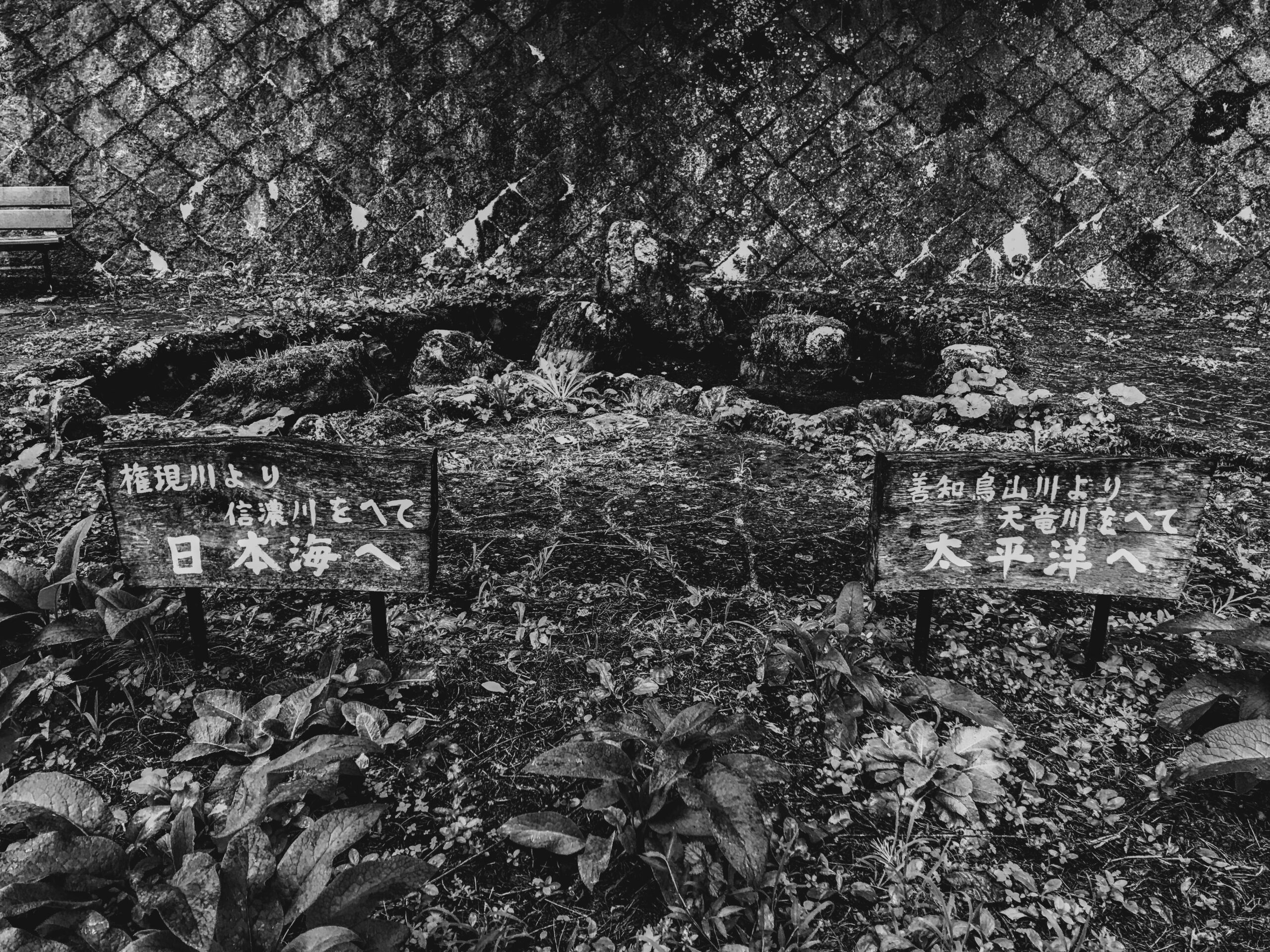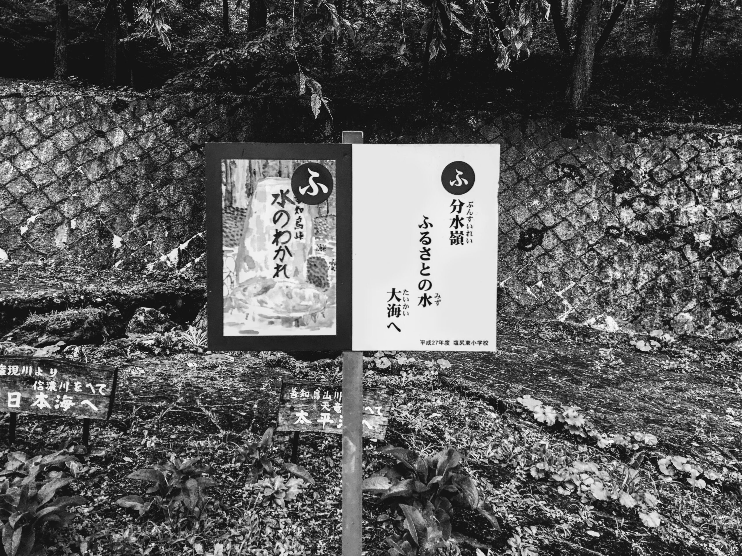 善知鳥峠にある分水嶺は、日本海にそそぐ信濃川と太平洋に注ぐ天竜川の分水嶺となります。