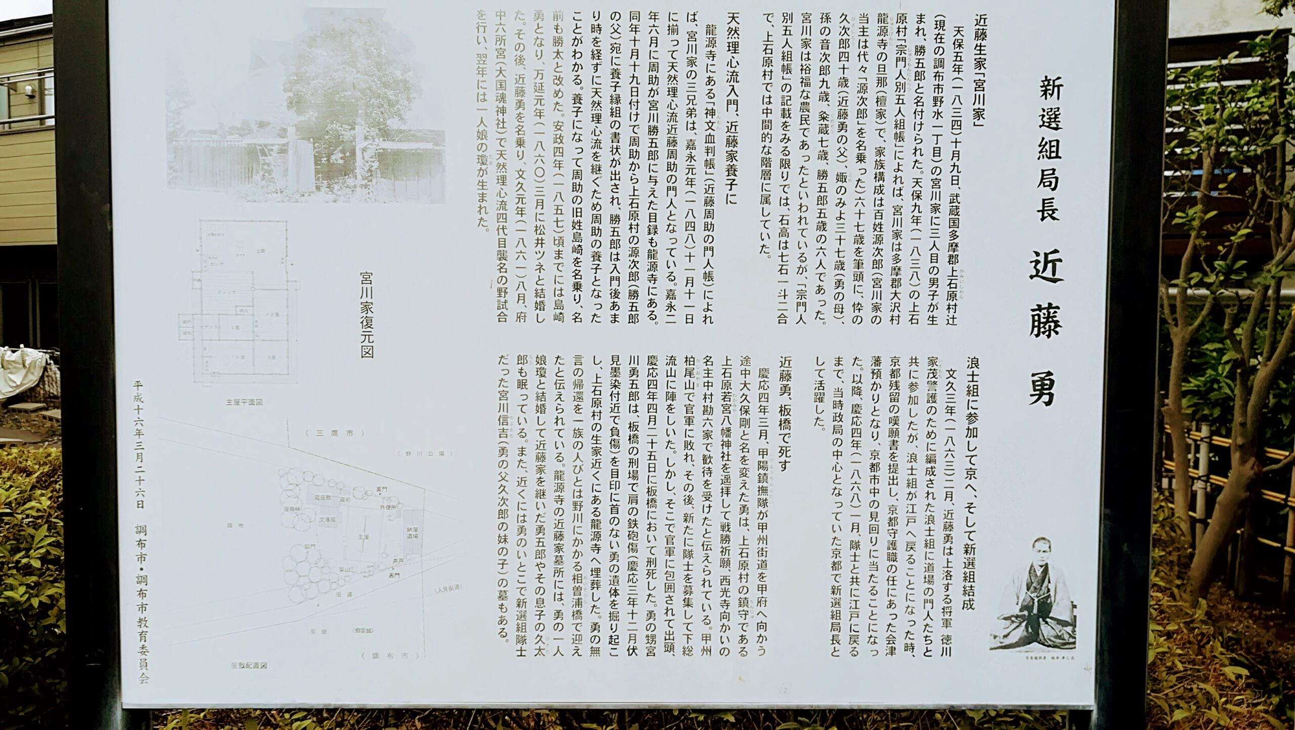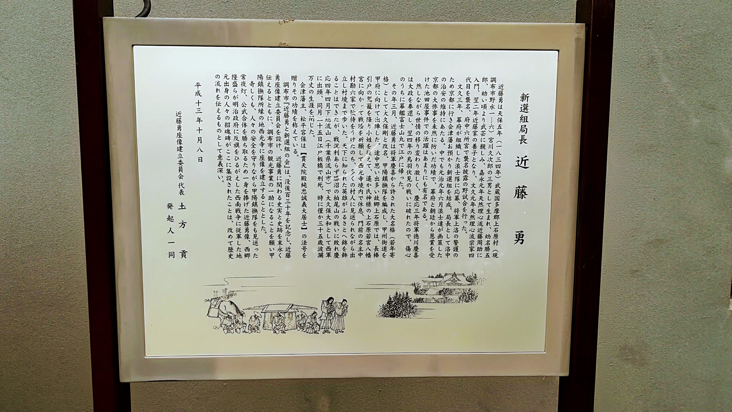 宮川久次郎の三男で、勝五郎と命名される。宮川家は裕福な農民だったと説明書きにはあった。1848年、天然理心流近藤周助の「試衛場」に入門。1849年、15歳の時に近藤周助の養子となる。1863年、29歳の時に、将軍家茂警固のための浪士組に参加、京都へ。その年に、新選組発足。1864年、有名な池田屋事件(ウィキペディア参照)。1868年、鳥羽伏見の戦い。敗れ、江戸へ戻る。1868年、3月、甲陽鎮撫隊として勝沼へ出陣。その際、スタート地点となる「西光寺」を訪問。