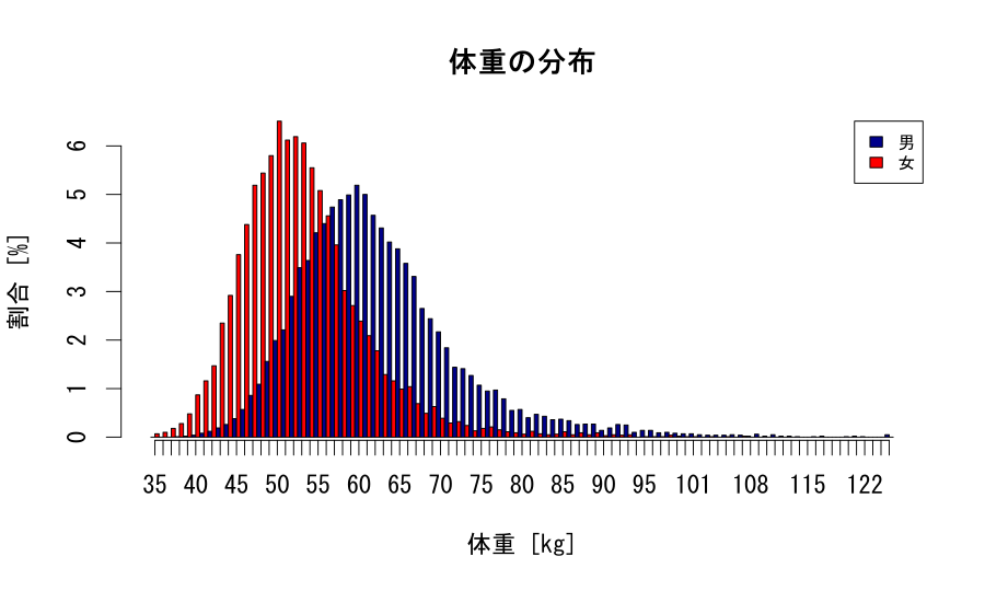 日本人の体重分布は、こんな感じです(平成27年度)。恐らく、2021年度においても、こんな感じの正規分布となっていると思われます。さて、この正規分布によると、実は、100㎏越えの体重は、かなり珍しいことを意味します。寧ろ貴重な存在と言えると思います。