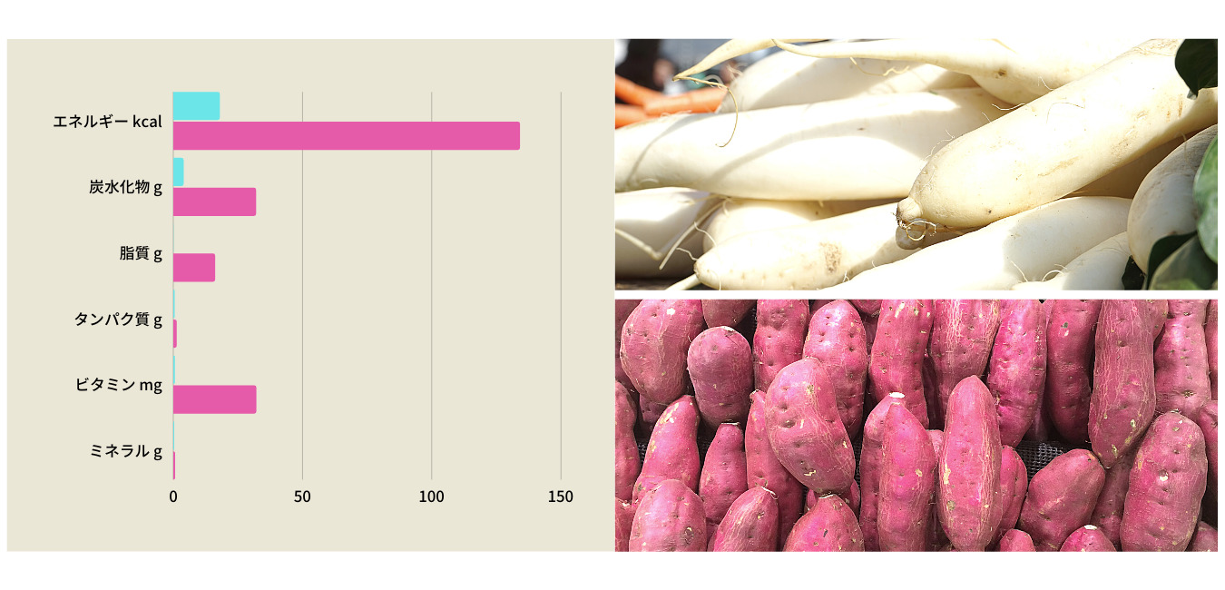 むらさき色がさつま芋、水色が大根となります。必ずしも栄養価が高いとは言えないですね。