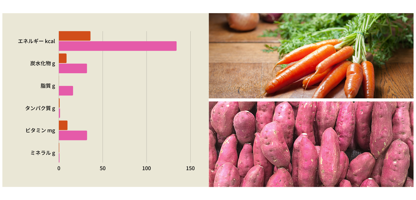 むらさき色がさつま芋、オレンジ色が人参となります。さつま芋のエネルギー量はすごい…