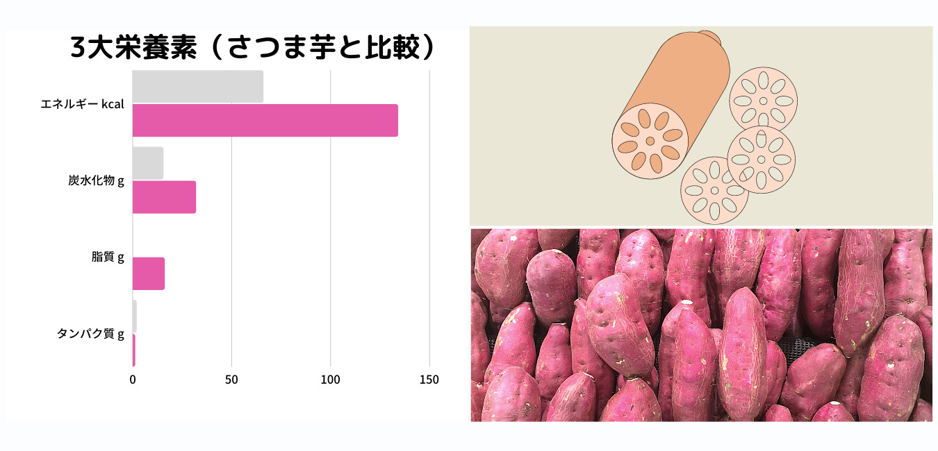 ここではエネルギー量が多いさつま芋と比較しております。さつま芋ってすごいですね。