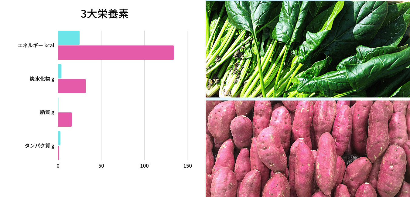 ここでは野菜界のカロリーメイトであるさつま芋と比較しております。さつま芋ってすごいですね。