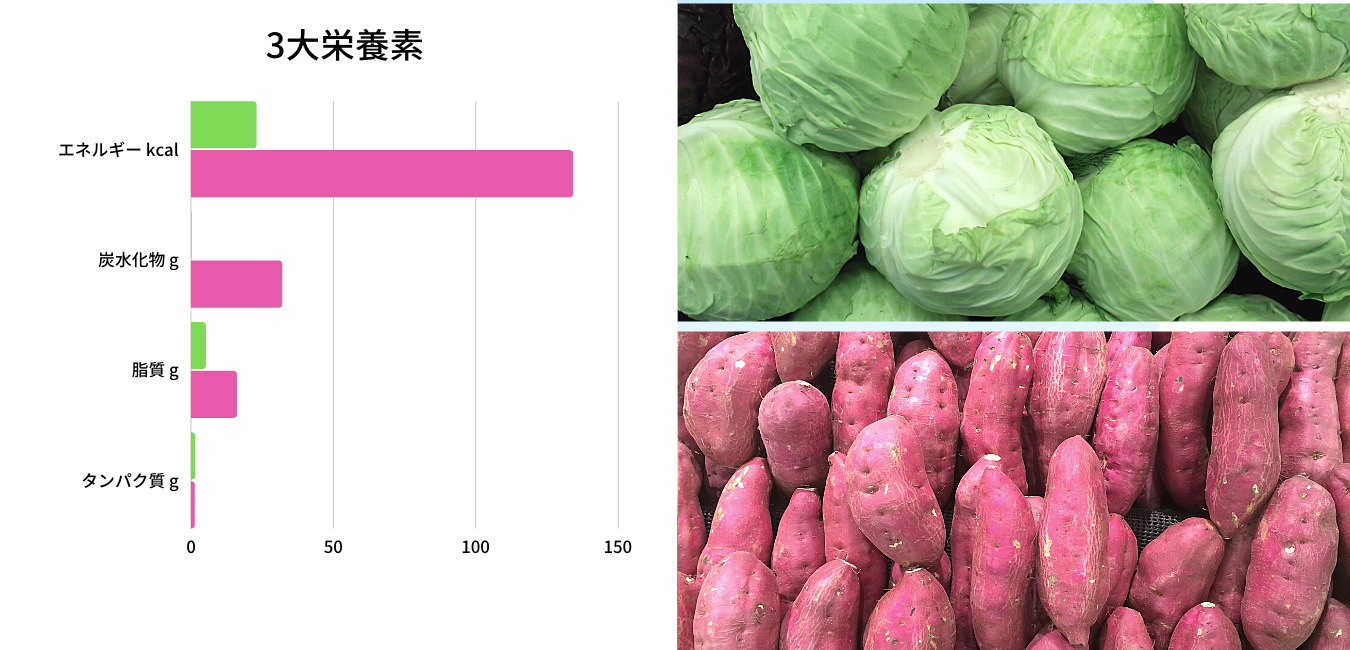 ここでは野菜界のカロリーメイトであるさつま芋と比較しております。さつま芋ってすごいですね。