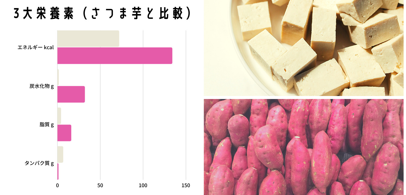 さて、木綿豆腐のエネルギー量は、100g当たり72kcal!野菜代表のさつま芋に比べたら低カロリーですね!