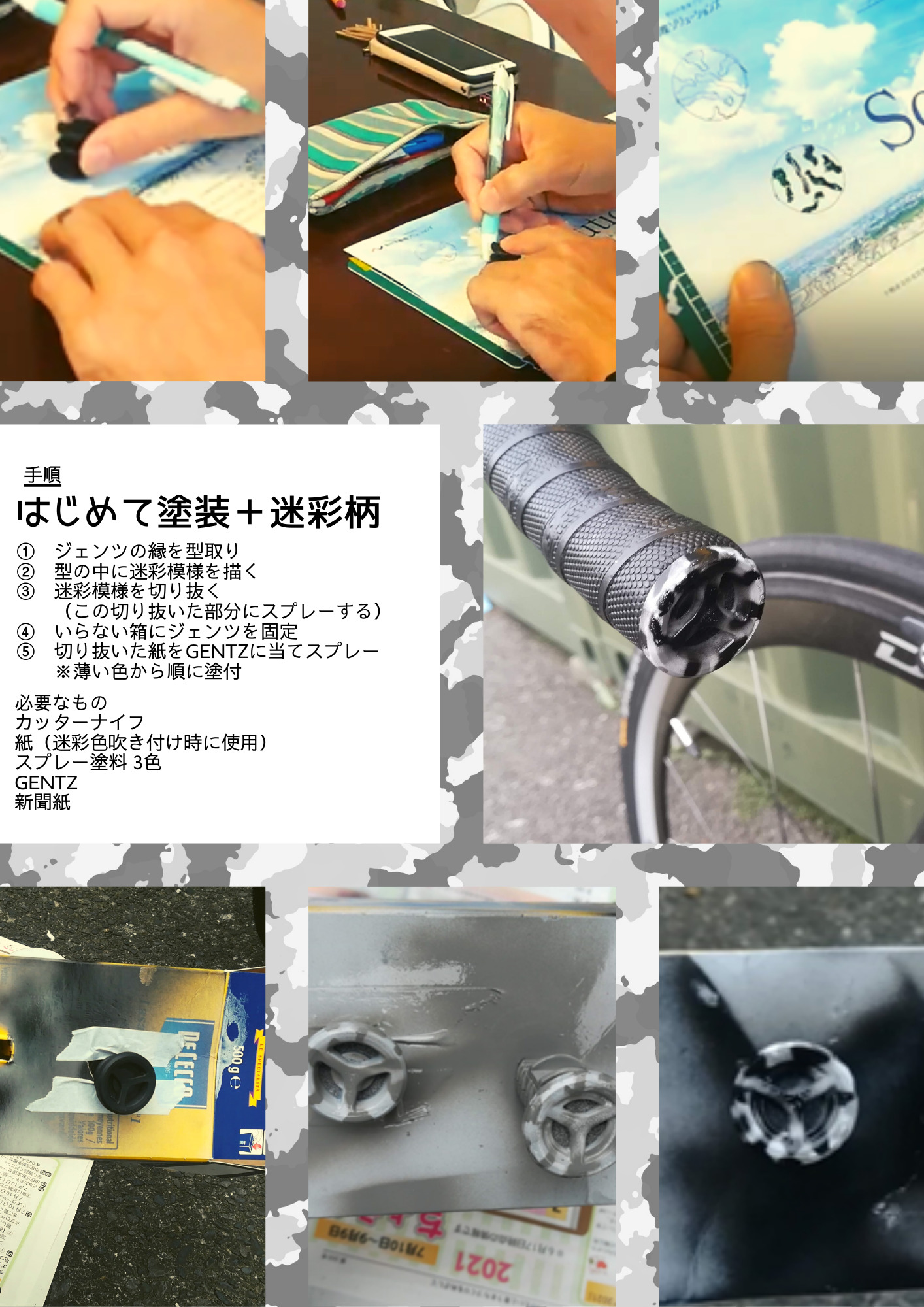 どうもGENTZ開発・販売担当の大道です。自分だけしか持ってないものって魅力的じゃないですか。GENTZはここ最近全国にユーザーが増えてきました。他のユーザーと被りたくない欲求。ロードバイク乗りの方の中にも人と同じことが嫌いな方多くいるのではないでしょうか?今回は、GENTZを迷彩柄に塗装してみるという遊びをご紹介です。
