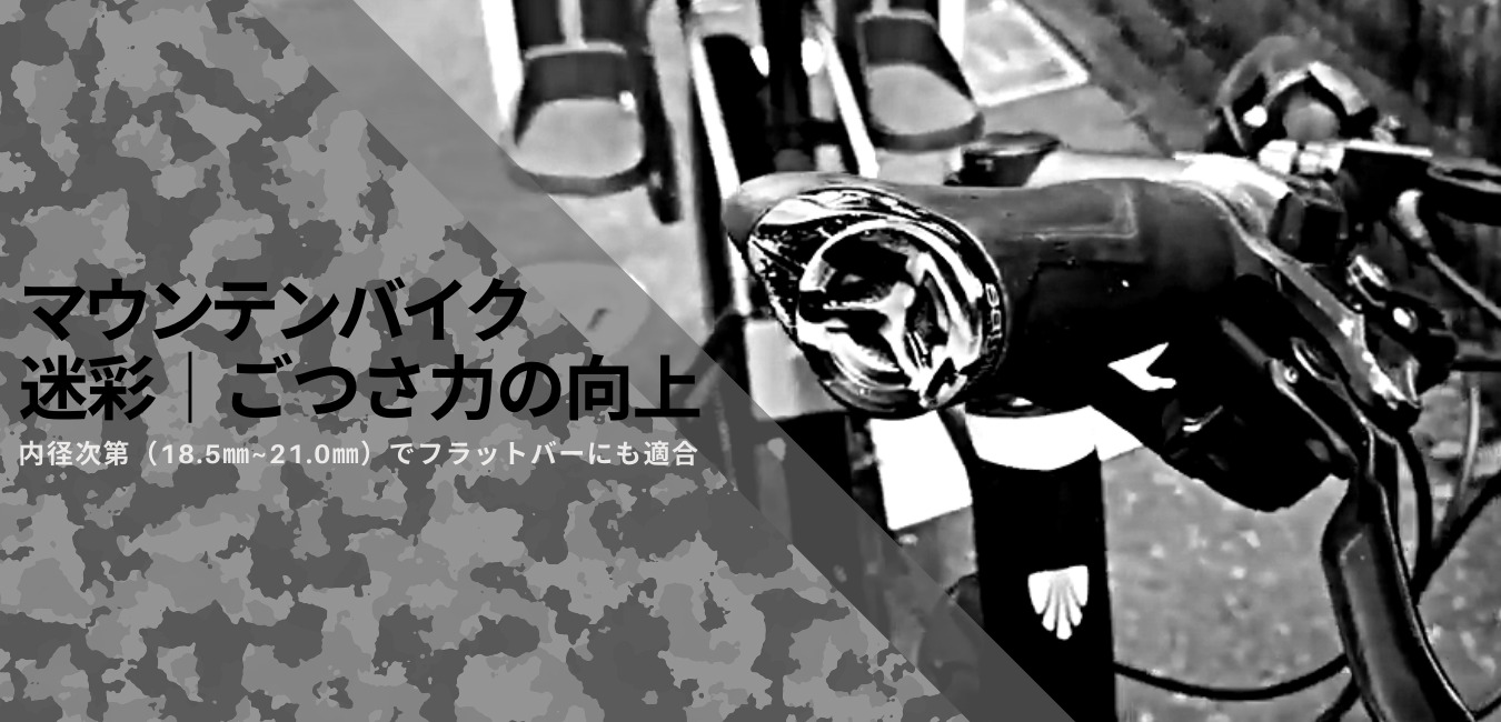 GENTZはロードバイク専用ではあるが、ハンドルバーの内径が18.5㎜~21.0㎜であれば、マウンテンバイクにも装着できる。マウンテンバイクと迷彩柄の相性はかなり良い。