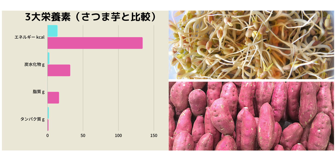 むらさき色がさつま芋、水色がもやしとなります。さつま芋のエネルギー量はすごい…